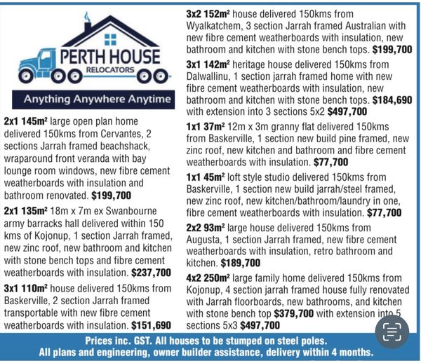 SOLD This 1900s Heritage 5 x 2 Homestead was fully renovated in 2019 at a cost of half a million dollars, completely framed out of Jarrah this house features an wrap around front Veranda, large open plan living and rear alfresco - for sale in conjunction with the owner $600,000.00neg.+ $359,350.00 plus GST and Stumping delivered 100kms